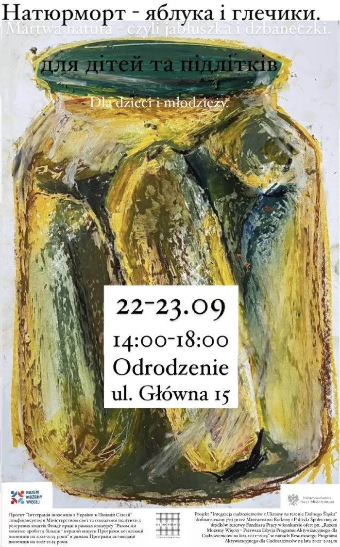 Майстер-класи з малювання натюрмортів. Запрошуємо українських дітей та молодь на майстер-класи 22 та 23 вересня з 14.00 до Центру «Відродження». Чудова розвага, інтеграція та вивчення польської мови за допомогою фарб!
