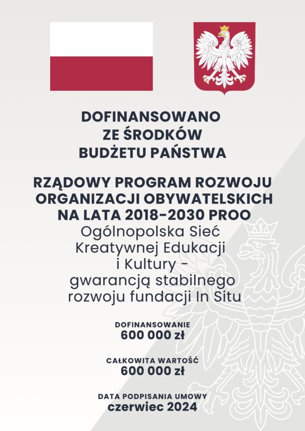 W ramach wsparcia finansowego uzyskanego z programu PROO 1a chcemy skoncentrować się na działaniach w zakresie stworzenia platformy współpracy Ogólnopolska Sieć Kreatywnej Edukacji i Kultury, która wzmocni misyjne działania fundacji.
