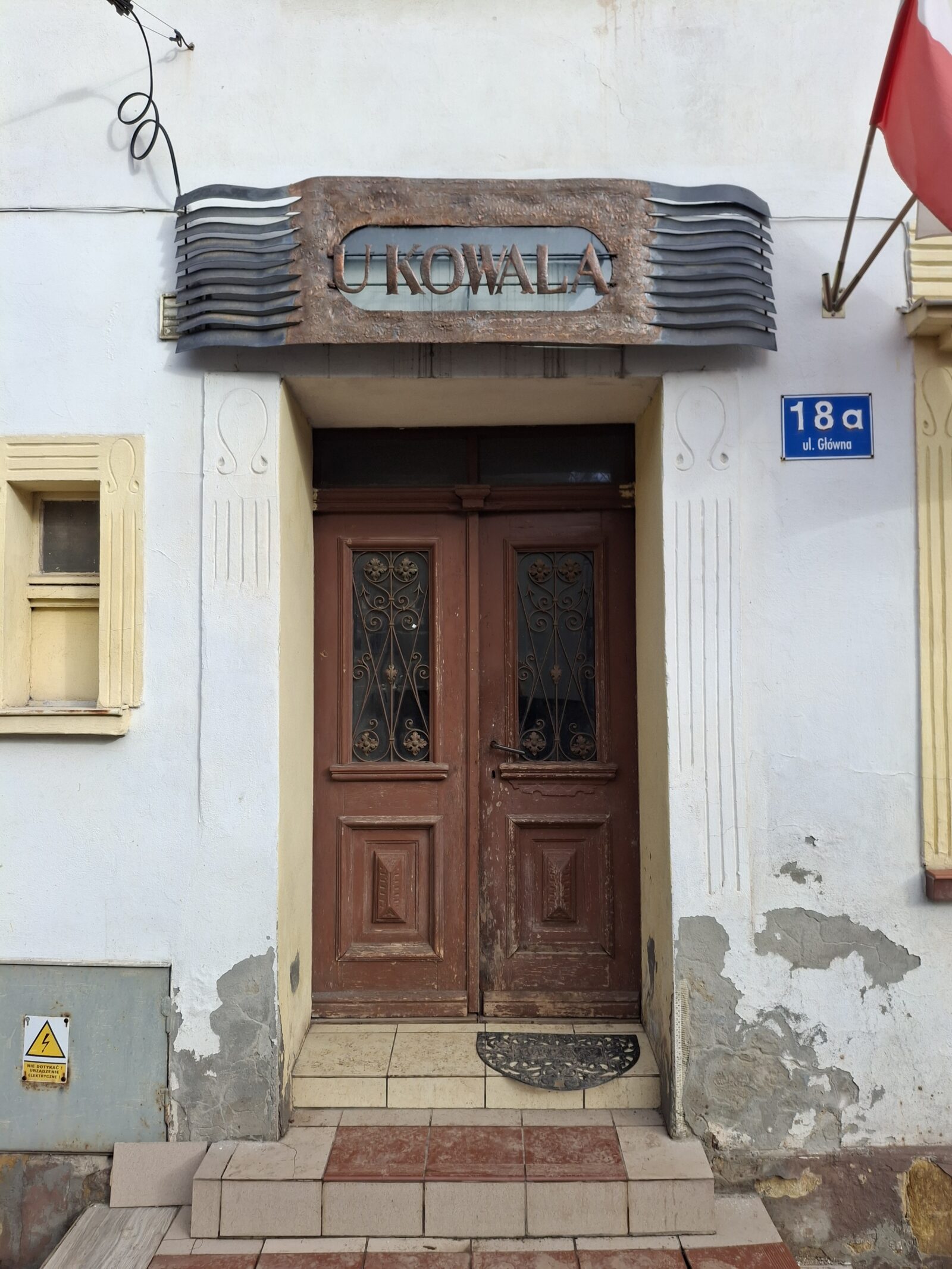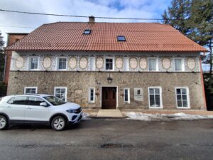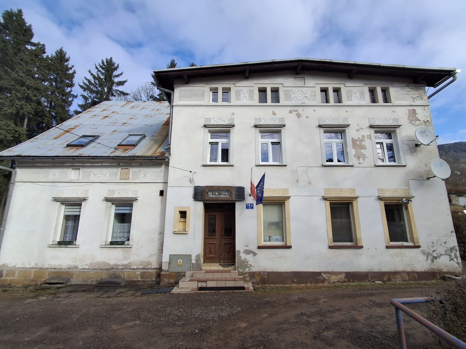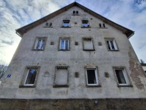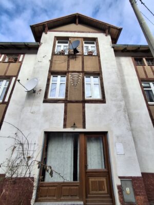 Budynek oznaczony numerem 18B, położony niemal na krańcu zabudowy przy ul. Głównej, wyróżnia się zachowanymi oryginalnymi niemieckimi płaskorzeźbami elewacyjnymi, funkcjonującymi dziś obok współczesnych elementów użytkowych, takich jak anteny satelitarne. To zestawienie uwidacznia ciągłość użytkowania obiektu oraz zmiany jego funkcji i estetyki w czasie, stanowiąc istotne świadectwo historycznej i społecznej ewolucji Sokołowska.