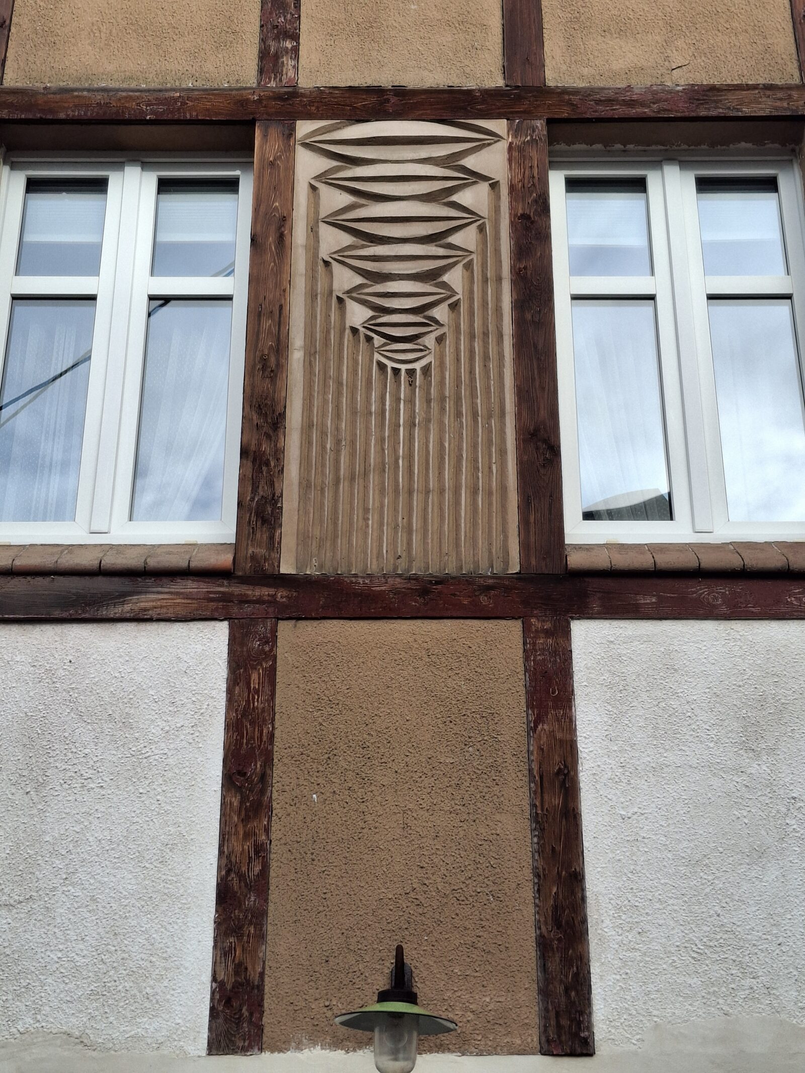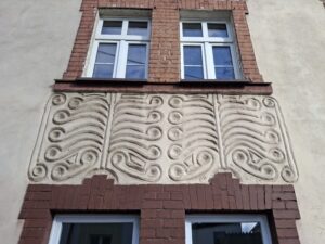 Dekoracje charakteryzuje umiarkowana głębokość reliefu oraz konsekwentne podporządkowanie architekturze — ornament nie konkuruje z formą budynku, lecz porządkuje jego płaszczyzny i wzmacnia czytelność podziałów. Zestawienie jasnego tynku z ceglanymi obramieniami okien i drzwi potęguje kontrast fakturalny i rytmiczny elewacji.