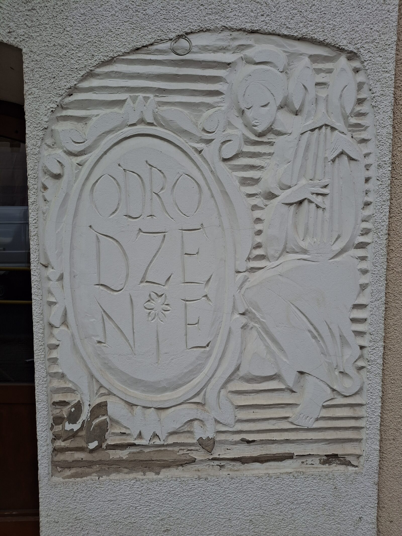 Płaskorzeźbę wykonano bezpośrednio w tynku, w technice rzeźbiarskiej o umiarkowanej głębokości opracowania. Centralnym elementem kompozycji jest owalne pole inskrypcyjne z napisem „ODRODZENIE”, ujęte w ornamentalną ramę o miękkim, falistym rysunku. Po prawej stronie przedstawiono stylizowaną postać kobiecą, ujętą frontalnie, w lekkim kontrapoście, z uproszczonym modelunkiem i syntetycznym traktowaniem detalu.