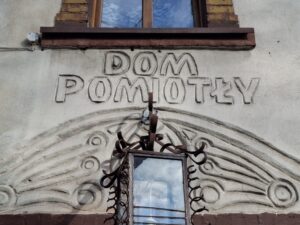 W strefie wejściowej umieszczono napis „DOM POMIOTŁY”, wykonany w formie reliefowej, o indywidualnie zaprojektowanej, nieregularnej typografii. Litery stanowią integralną część kompozycji plastycznej elewacji i pełnią funkcję identyfikacyjną, łącząc ornament z warstwą znaczeniową i lokalną historią miejsca.