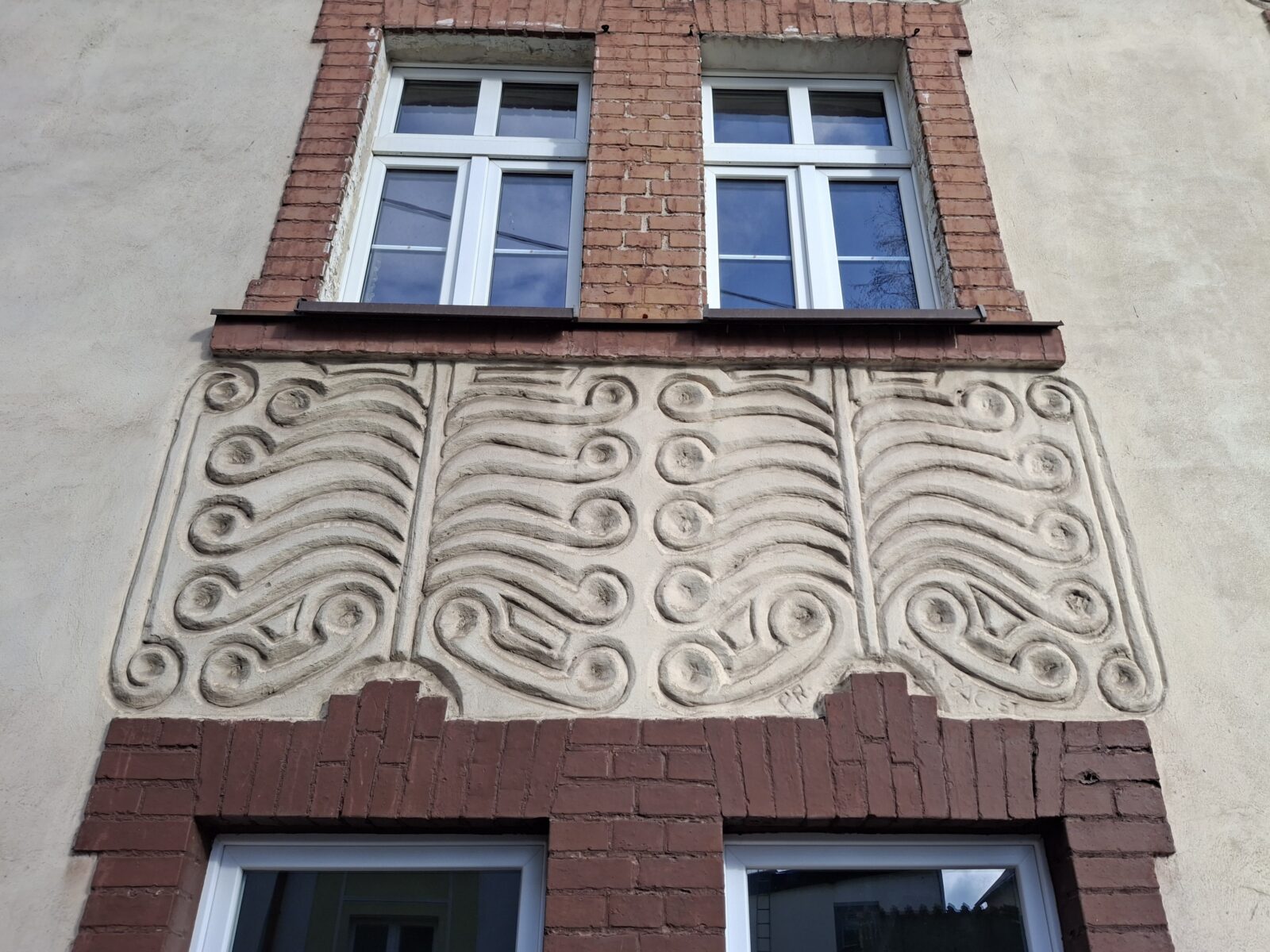 Dekory wykonano w technice reliefu tynkarskiego, modelowanego w mokrej zaprawie. Ich forma opiera się na rytmicznie prowadzonych, falistych i spiralnych liniach, układanych symetrycznie względem osi okna. Motywy mają charakter abstrakcyjny, jednak wyraźnie widoczne są inspiracje formami organicznymi — szczególnie stylizowanymi liśćmi, pędami roślinnymi oraz motywami przypominającymi ślimacznice i rozgałęzienia.