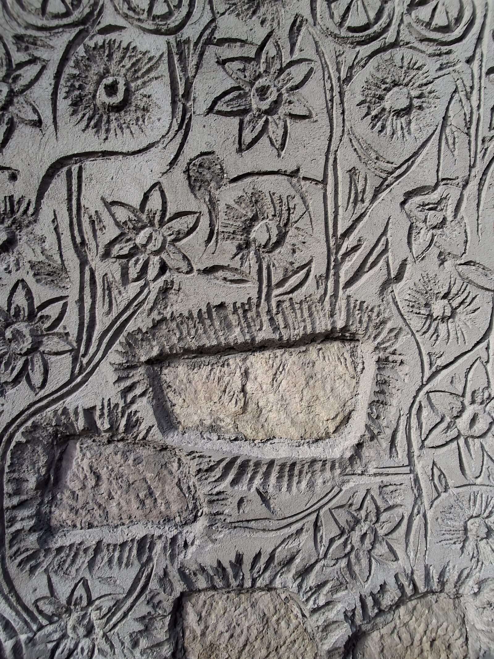 Motywem dominującym są stylizowane formy roślinne: kwiaty o promienistych główkach oraz wydłużone, symetrycznie rozmieszczone liście i łodygi. Kompozycja ma charakter rytmiczny i powtarzalny, lecz nie jest mechanicznie modularna — poszczególne elementy wykazują drobne różnice w rysunku i głębokości opracowania, co wskazuje na ręczne wykonanie. Relief ma niewielką głębokość, szacunkowo od ok. 1 do 2 cm, i operuje subtelnym światłocieniem.