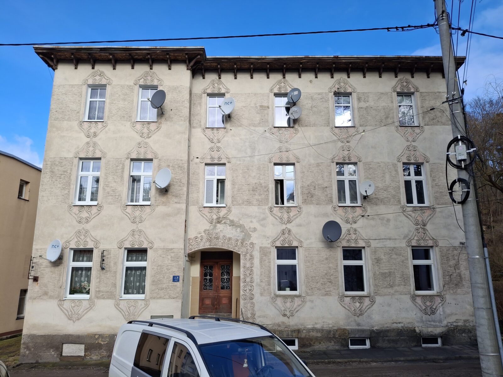 Na elewacji parteru budynku przy ul. Słonecznej 1, od strony ul. Głównej, zachowała się dekoracja elewacyjna o charakterze przestrzennym, okalająca otwór drzwiowy oraz szeroką witrynę dawnego lokalu usługowego.