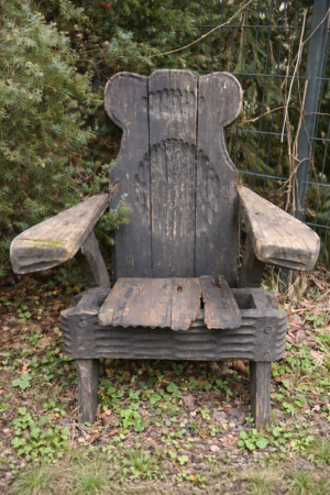 Siedzisko i podłokietniki zachowują prostotę konstrukcyjną, lecz noszą ślady ręcznej obróbki: nieregularności krawędzi, widoczne rysy, spękania i ubytki materiału. Powierzchnia drewna nie została wygładzona ani ukryta pod warstwą wykończeniową — przeciwnie, ślady użytkowania, naturalne starzenie się materiału oraz patyna stanowią integralny element estetyki obiektu.