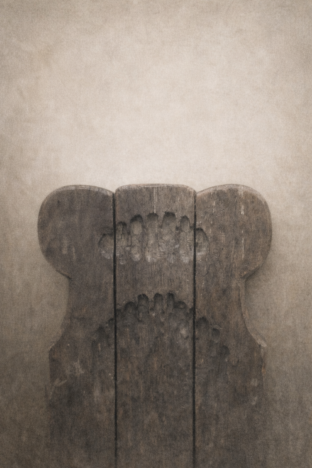 Konstrukcja krzesła opiera się na masywnych, prostych elementach nośnych, zestawionych w czytelną, stabilną bryłę. Oparcie składa się z pionowych desek o wyraźnie zaznaczonym obrysie, zwieńczonych symetrycznymi, obłymi wycięciami, nadającymi całości formę znaku lub sylwety. W górnej partii oparcia widoczne są rytmiczne nacięcia, pełniące funkcję dekoracyjną, a jednocześnie porządkujące płaszczyznę drewna.