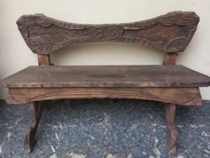 Ławka autorstwa Stanisława Olszamowskiego jest przykładem autorskiego mebla o wyraźnie rzeźbiarskim charakterze, łączącego funkcję użytkową z ornamentalnym opracowaniem formy. Wykonana z litego drewna, zachowuje surowość materiału oraz widoczne ślady ręcznej obróbki, które stanowią integralny element jej wyrazu plastycznego.