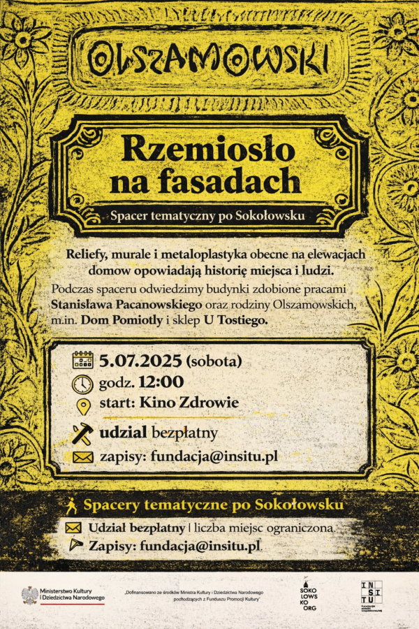 Spacer szlakiem budynków zdobionych pracami Stanisława Pacanowskiego oraz rodziny Olszamowskich, m.in. „Domu Pomiotły” i sklepu „U Tostiego”. Przewodnicy opowiedzą o technikach tworzenia reliefów, murali i elementów metaloplastyki obecnych w przestrzeni Sokołowska 🎨🔨.