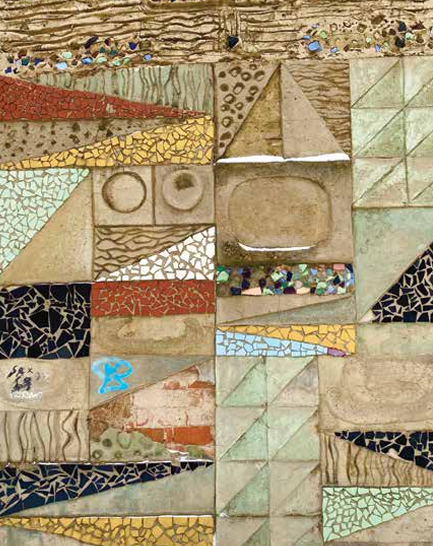 Dekoracja ma charakter abstrakcyjno-geometryczny. Jej kompozycja opiera się na zestawieniu trójkątów, pasów ukośnych i prostokątnych pól, wypełnionych zróżnicowanymi fakturami: od drobnych, nieregularnych układów mozaikowych, po gładkie lub rytmicznie żłobione powierzchnie tynku. Widoczna jest świadoma gra kontrastów materiałowych i kolorystycznych — zestawienia matowych i błyszczących powierzchni, stonowanych odcieni beżu i zieleni z akcentami ciemnego granatu, czerni oraz ceglastych czerwieni.