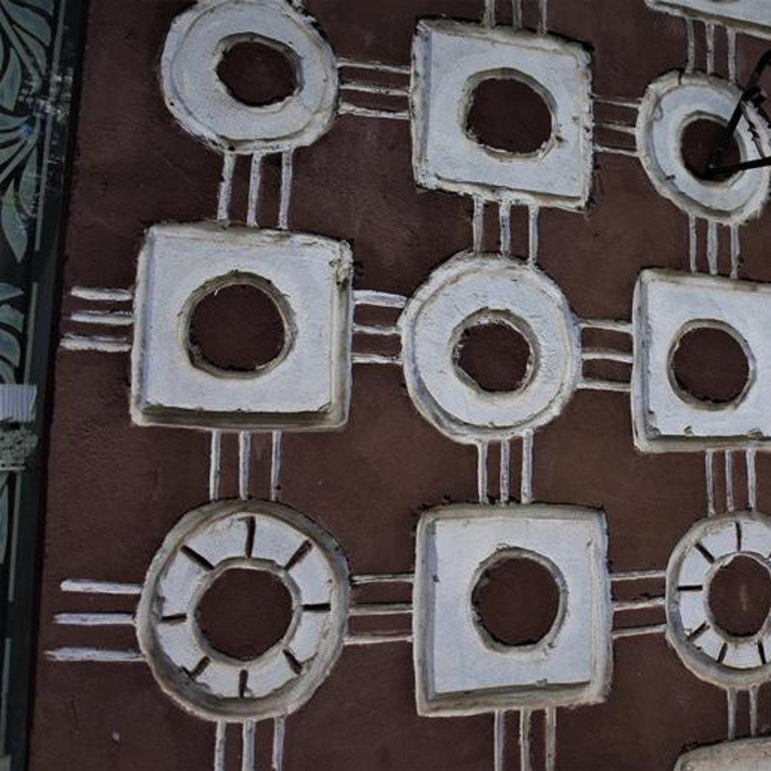 Dekoracja została wykonana bezpośrednio w tynku, w technice reliefu modelowanego w mokrej zaprawie. Jej kompozycja opiera się na regularnym, modularnym układzie powtarzalnych elementów geometrycznych: form kwadratowych i kolistych z centralnie umieszczonym otworem. Poszczególne moduły połączone są liniowymi, rytmicznie prowadzonymi wypustami tynku, tworzącymi układ przypominający schemat sieci lub ornamentalny fryz.